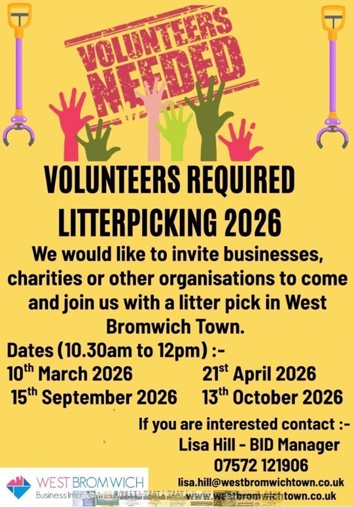 West Bromwich BID would like to invite businesses, charities, or any other organisations to come and join the BID Team with Litter Picking round West Bromwich Town.