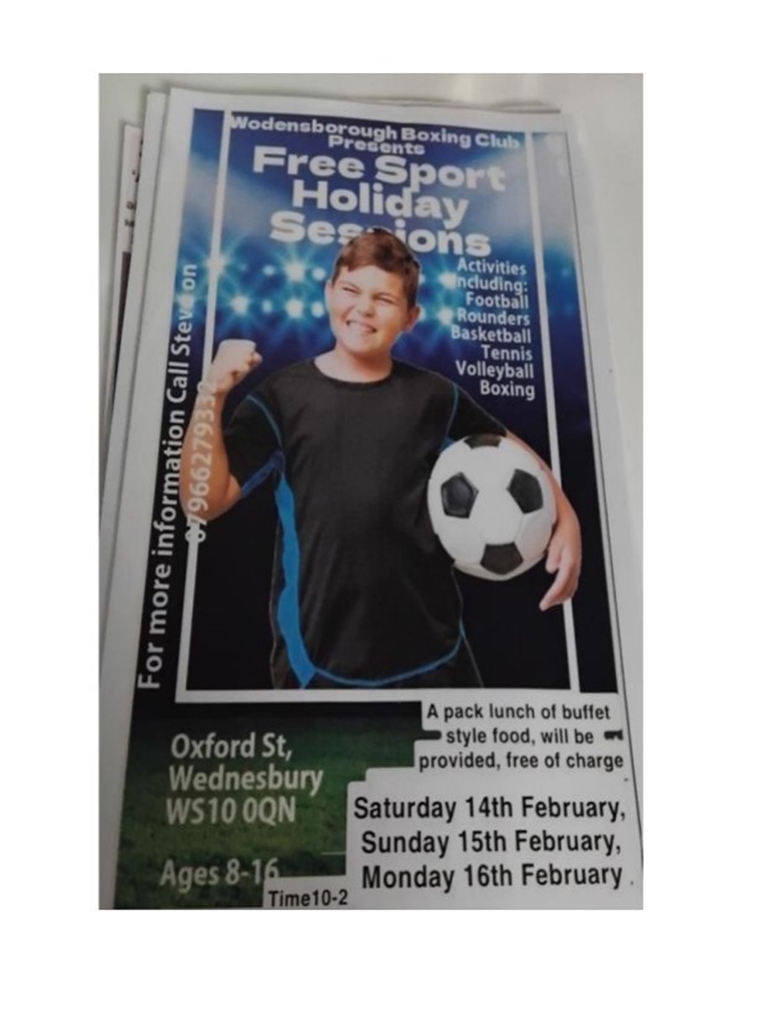 Wodensborough ABC is offering free sports holiday sessions for children aged 8-16 at Oxford Street, Wednesbury, WS10 0QN). Activities will include football, rounders, basketball, tennis, volleyball and boxing. Sessions run from 10am-2pm on Saturday 14th Feb until Monday 16th February, with a free packed lunch or buffet-style food provided. See attachment Wodensborough ABC
