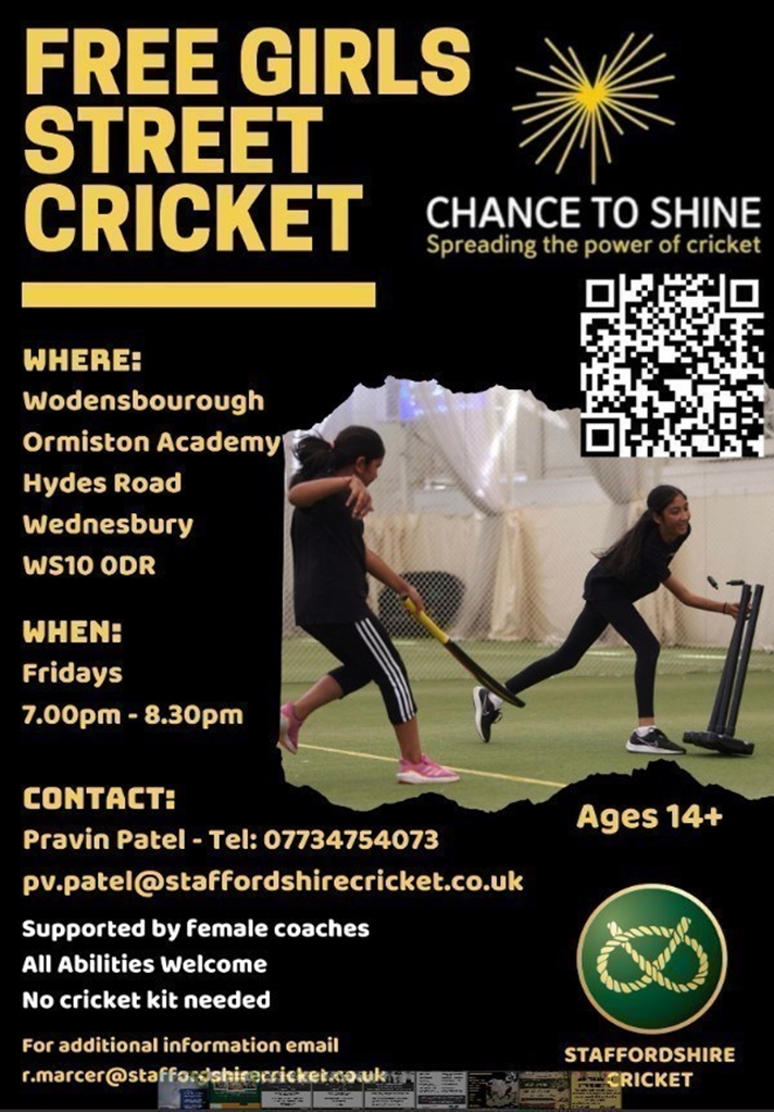 Staffordshire Cricket are offering free cricket for women and girls 14+, all abilities welcome, supported by female coaches. Please see attached poster, ‘Wednesbury Girls Street Cricket’, for more information or contact Pravin via email: pv.patel@staffordshirecricket.co.uk or phone: 07734 754073.